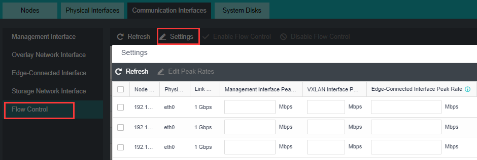 It is recommended to set the upper limit of traffic when the four networks of management, VXLAN, service, and storage are integrated to ensure the stability of network traffic. After the speed limit is enabled, you can view the throughput of the management interface, VXLAN interface, Edge interface, and storage interface on the Nodes >Summary page.