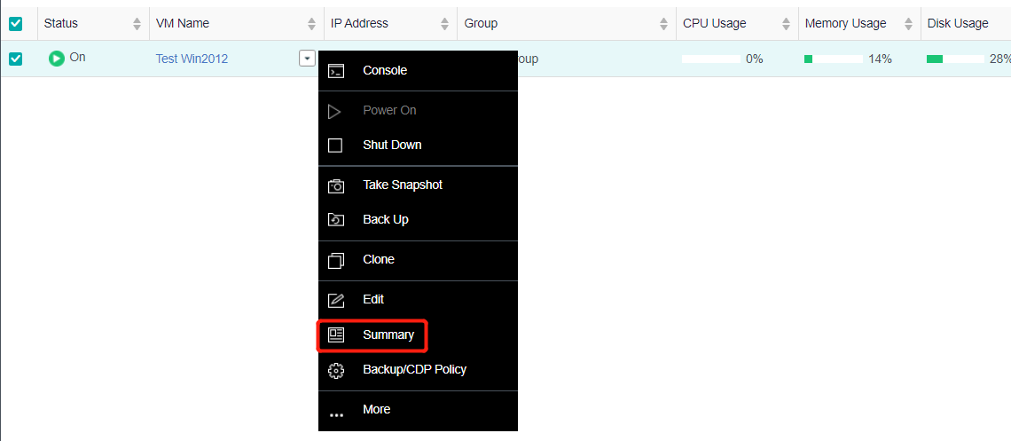 Check the virtual machine's CPU, Memory, and Disk capacity utilization on the Summary page.