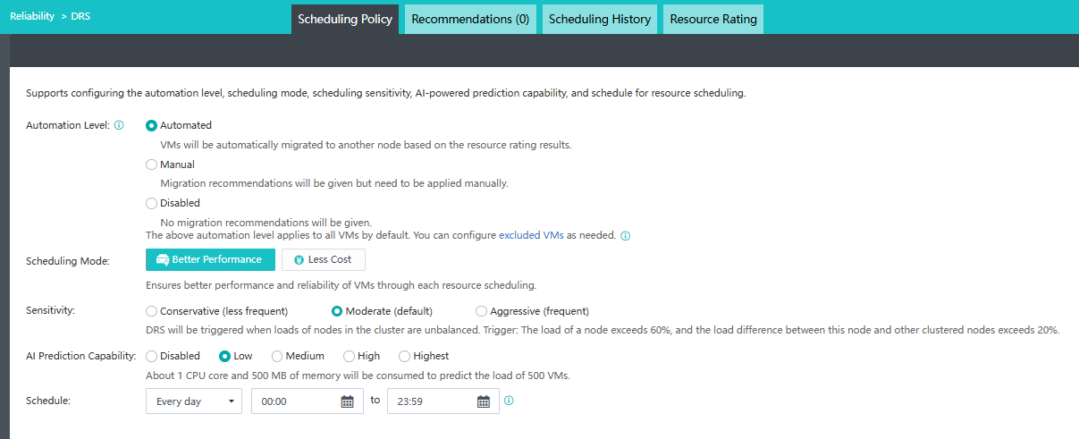 Select a Scheduling Mode, based on which the optimal destination nodes and recommendations are given to optimize the cluster. The Better Performance mode balances the load on each node, and the Less Cost mode saves node resources by centralizing VMs to run on one or more nodes as much as possible.