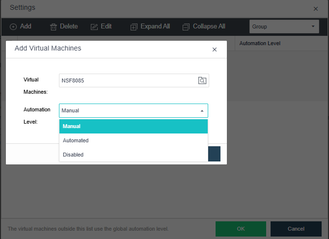 Configure Automation Level (Automated, Manual, Disabled) for specific VMs as needed.