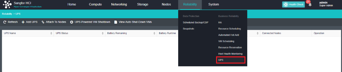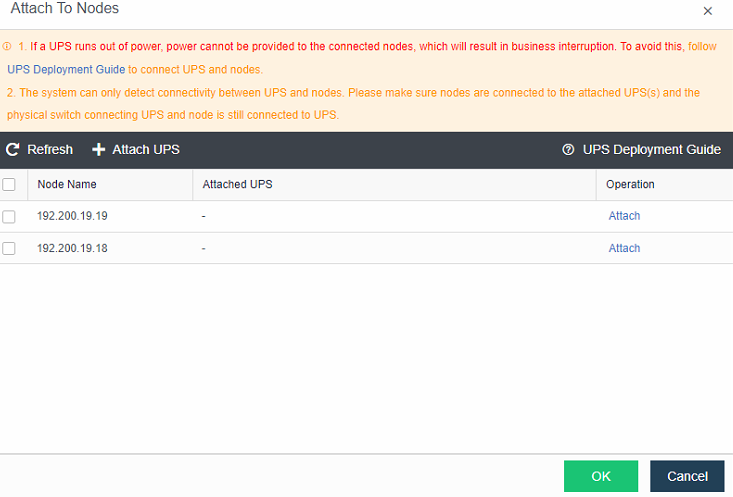 After the UPS power supply is added to the HCI, click Attach to Nodes to associate the UPS with the node.