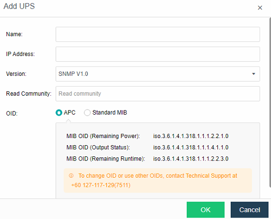 Go to Reliability > UPS and click Add UPS. Enter the name, IP address, version, and read community, select the appropriate OID and click OK to add.