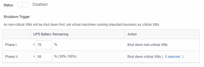After the shutdown policy is enabled, the virtual machine running on the associated node will be shut down when the UPS's battery power is lower than the set threshold. Still, the physical node will not be shut down.