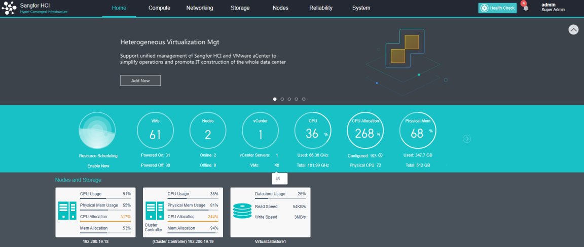 On the Home page, you can see the running status of the nodes in the cluster, including the number of nodes in the cluster, the number of virtual machines, and the number of storage, as well as the usage of CPU, memory, and storage in the cluster, as well as the usage of each node.