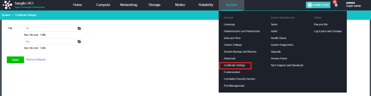 Go to System > Certificate Settings in the console and import the correct .crt and .key certificates. Select Ignore certificate validity as needed. If this option is selected, you can import a certificate with a validity period of longer than 365 days. Then, click Save.