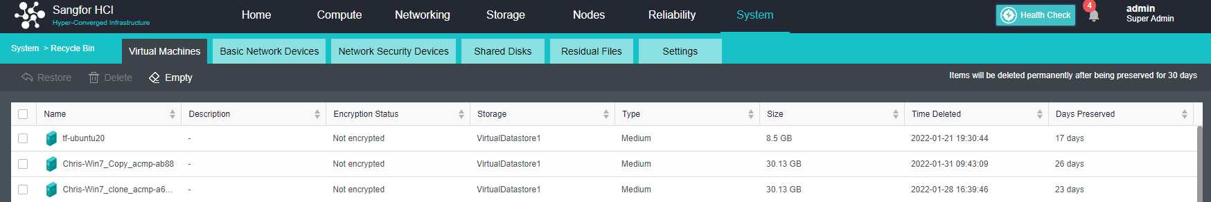 Users delete virtual network devices, virtual machines, shared disks, etc., on the web admin console. They will be temporarily stored in the recycle bin to prevent data loss due to misoperation. The files in the recycle bin support recovery and complete deletion. If you do not manually delete or empty the recycle bin, the files in the recycle bin will be retained for 30 days by default and then completely deleted.