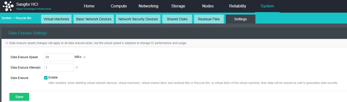 If Data Erasure is enabled, when deleting virtual network devices, virtual machines, shared disks, residual directories in the recycle bin, and deleting virtual disks of virtual machines, the data will be erased at the same time. Keep data safe.