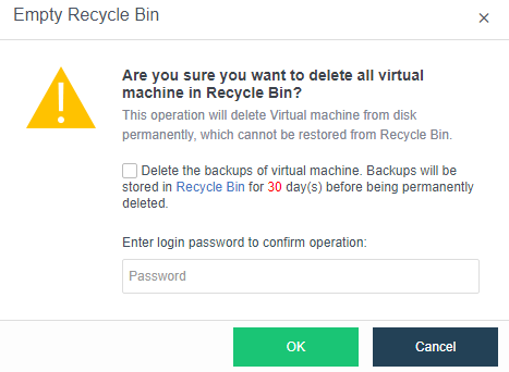 Click the Virtual Machines tab. Select the virtual machine and click Delete or click Empty. The operation will prompt the option: Delete the backups of the virtual machine. Backups will be stored in Recycle Bin for 30 days before being permanently deleted.Check this checkbox and enter the HCI administrator password to completely erase the virtual machine's data.