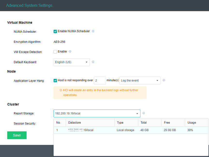 Enter the System > Advanced System Settings interface, select the datastore, and click Save.