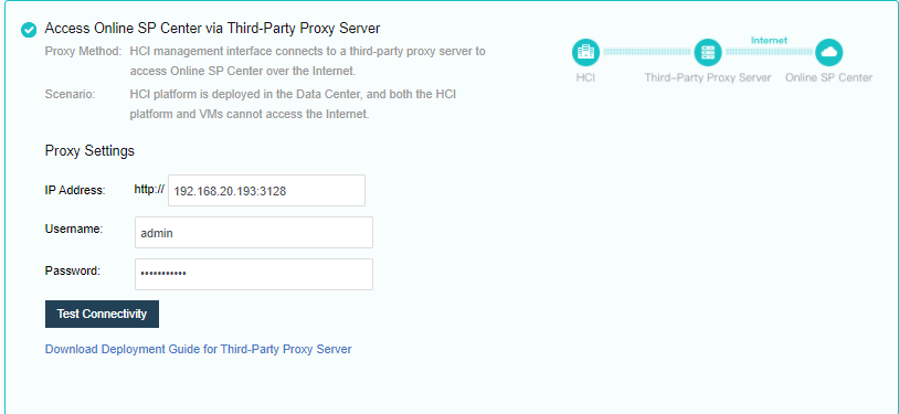 • Fill in the address (IP + port, example: 10.250.0.20:3128) of the agent set in step 2 on the HCI platform. And the authentication user name and password of the agent are set during the deployment of the proxy server.