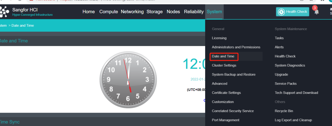 Go to System > Date and Language in the console. On the Date and Time page, check whether the HCI cluster time is accurate. If not, click Change.