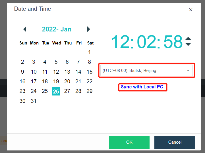 Click the triangle icon to fine-tune the time or click Sync with Local PC. You can also change the time zone.