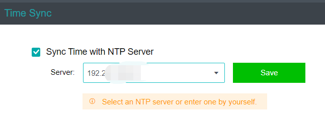 To keep the time in sync with that of the internal Network Time Protocol (NTP) server, select Sync Time with NTP Server, specify the server IP address, and click Save.