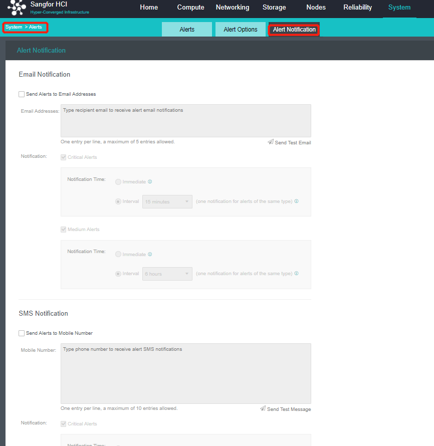Enter the configuration interface: open the console and enter System > Alert > Alert Notification. Check the Send Alerts to Email Addresses or Send Alerts to Mobile Number checkbox as required. Before setting, you need to set up a mail server or SMS server.