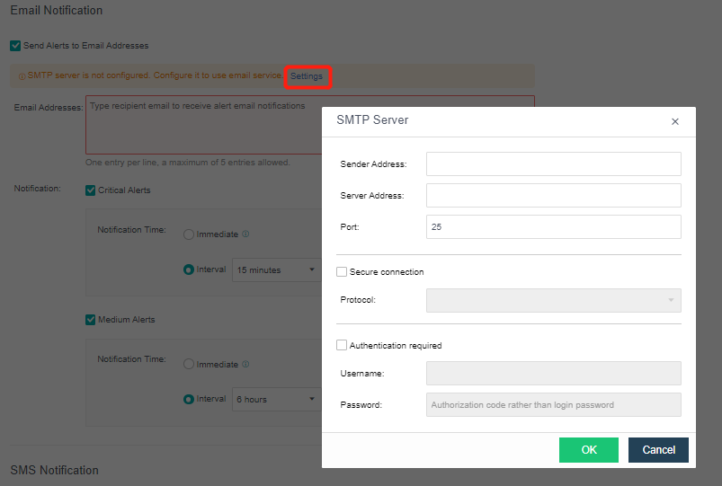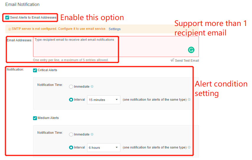 Send to the specified mailbox: Check the Send Alerts to Email Addresses checkbox. If the mail server is not configured, click Setting. If the configuration already exists and needs to be modified, click Edit. Fill in the configuration information of the Mail server and click OK to save the settings. Fill in the email address that can be delivered by the mail server as required, set the condition for triggering the alarm notification as needed, and click Save to complete the configuration.