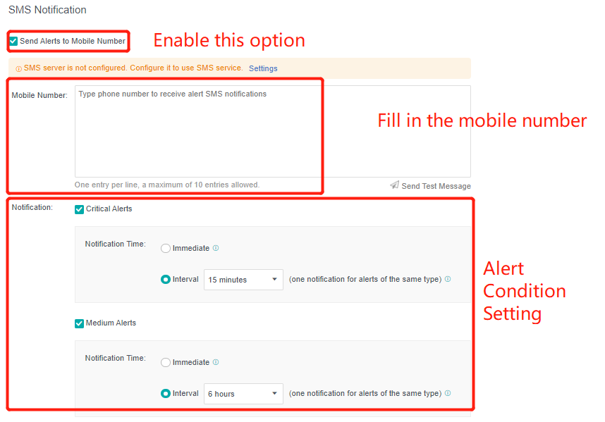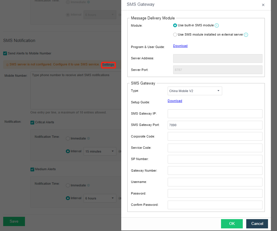 Send to specified mobile phone number: check the Send Alerts to Mobile Number checkbox. If the SMS server is not configured, click Setting. If the configuration already exists and needs to be modified, click Edit. Fill in the configuration information of the SMS server and click OK to save the settings. When there is a problem with the SMS server configuration, you can download the guidance document by clicking the Download button. Fill in the mobile phone number of receiving SMS as required, set the conditions for triggering alert notification as required, and click Save to complete the configuration.
