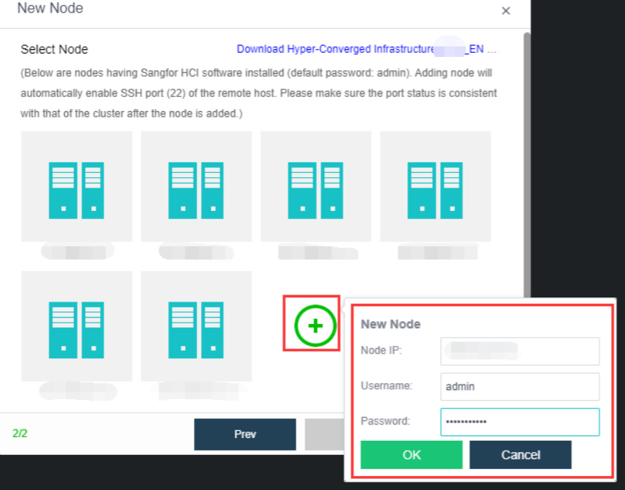 On the following page, select a node you want to add to the cluster and input the corresponding username and password. Once a node is chosen, the node icon turns green, indicating the node can be added to the cluster. There will be a prompt to reconfigure the firewall configuration of the added node and execute the node addition task.