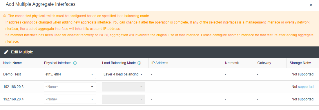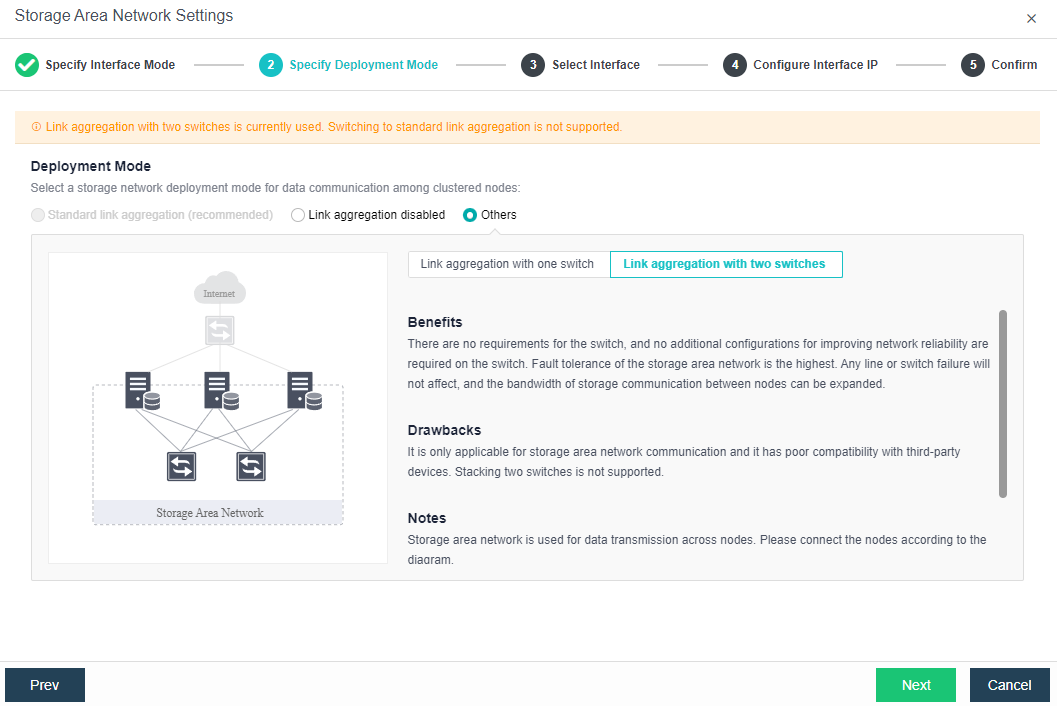 For versions upgraded to 6.8.0 or later, the aggregation mode of the storage network remains unchanged. For 6.9.0 and later, you can change the mode to standard link aggregation. Before the change, you need to shut down all VMs and virtual network devices.