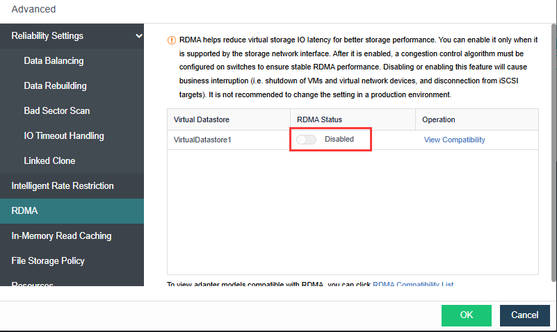 Go to Storage > Virtual Storage > Advanced > RDMA to enable RDMA for a virtual datastore. You can click View Compatibility to view whether the adapter models and the firmware versions of the storage network interfaces support the RDMA feature.
