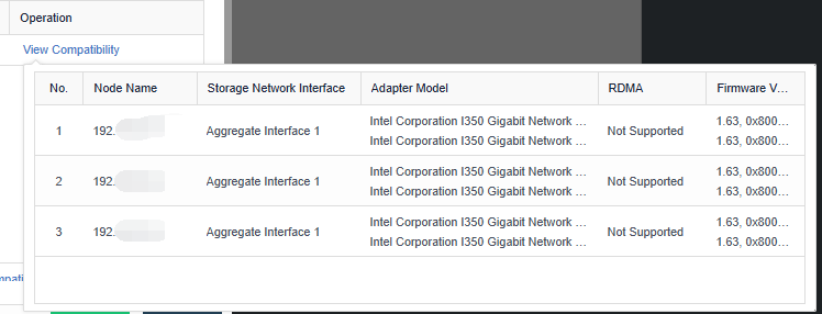 Please make sure that the model of the storage adapter and its firmware version support RDMA. To query the adapter models and firmware versions supported by RDMA (passed the beta test), go to the adapter vendor’s official website or Sangfor HCI Compatibility Chart via: https://www.sangfor.com/cloud-and-infrastructure/products/hci-compatibility-chart.