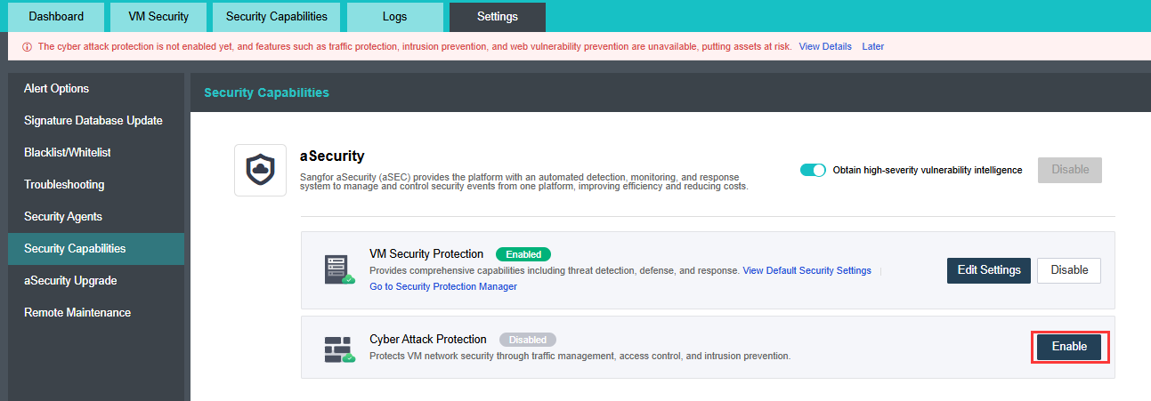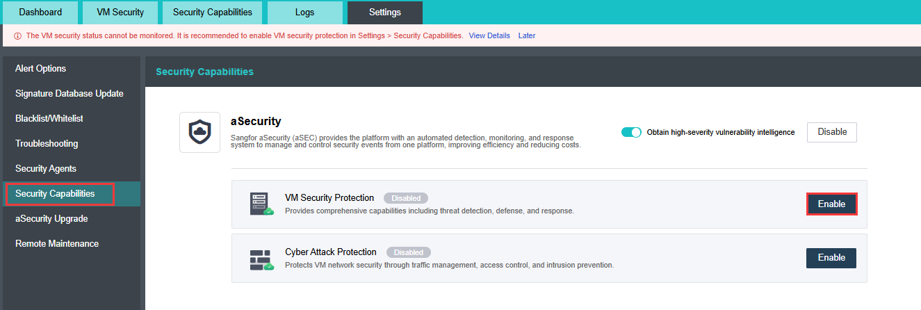 Go to Security Settings > Security Capabilities and click Enable for VM Security Protection