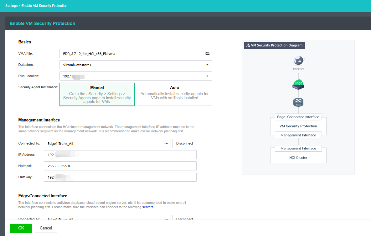 • Management interface: Specify the connection to the physical interface (this physical interface must have access to the HCI management interface, and we recommend that you plan it on the same segment as the HCI management network).