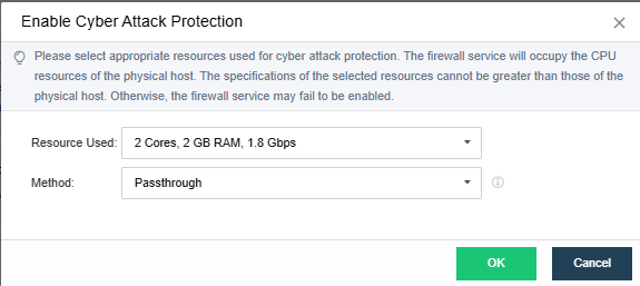 If cyber attack protection is enabled, it occupies the CPU and memory resources of each physical host, which can be 1 CPU core, 1 GB memory by default and 8 CPU cores, 8 GB memory at maximum.
