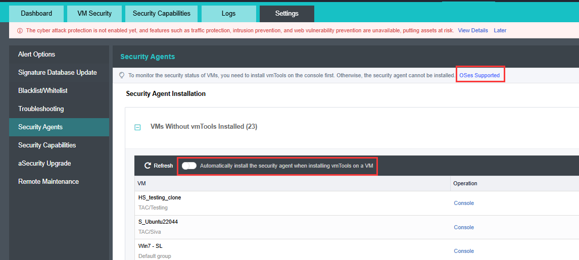 Go to Security Settings > Security Component Installation and check Auto-install security component during vmTools installation. Then, aSecurity automatically detects new assets and installs security components for VMs through vmTools. In addition, the VM security protection platform supports automatically updating security components through vmTools. You can view the compatibility whitelist of operating systems by clicking View Supported Operating Systems.