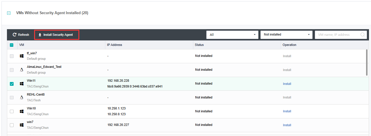 • If Auto-install security component during vmTools installation is not checked, which may be the case that businesses are running, and security protection and monitoring are required only for some of the VMs, you can select the VMs from the list and click Install Security Component for bulk installation.