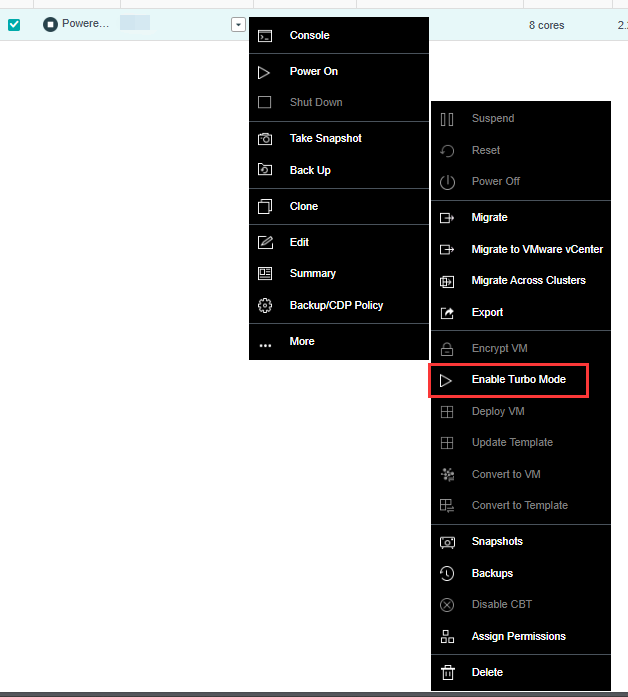 Click More of the VM again, and go to More > Enable Turbo Mode.