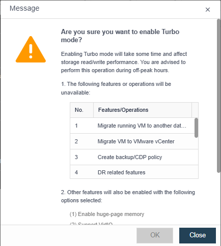 Turbo mode cannot be enabled for VMs with snapshots.