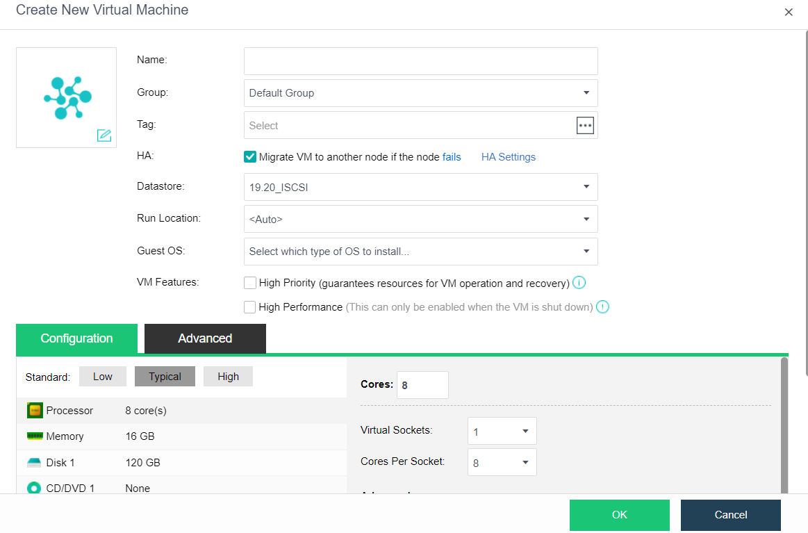 • High Performance: When selected, it is marked as an important virtual machine by default. It enables huge-page memory, uses Host CPU and Para-virtualized clock, and pre-allocating. When deselecting the High Performance, the above-enabled functions need to be turned off manually.