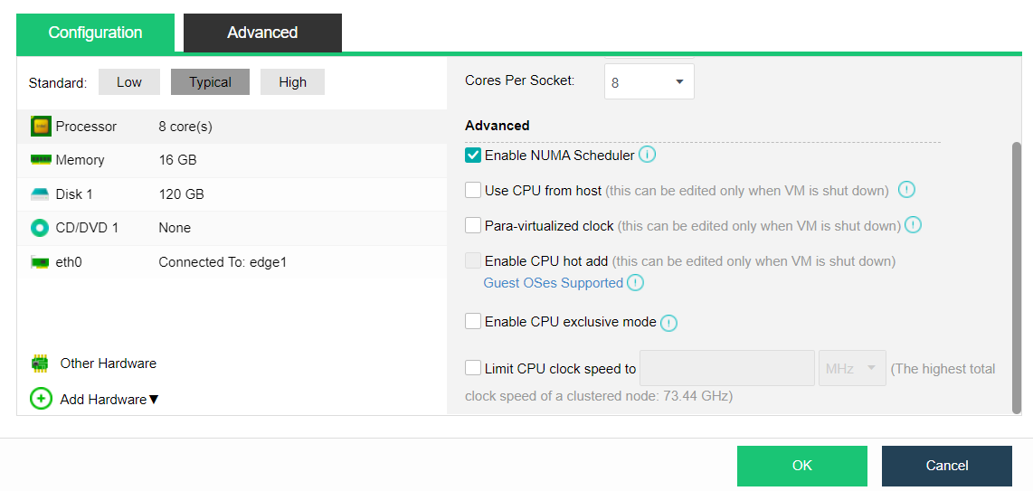 • Limit CPU clock speed to: Enable to limit the upper limit clock speed used by the virtual machine vCPU. The limit range is 100mhz to 1000ghz. The recommended value will be displayed in the input box when the virtual machine runs for one week.