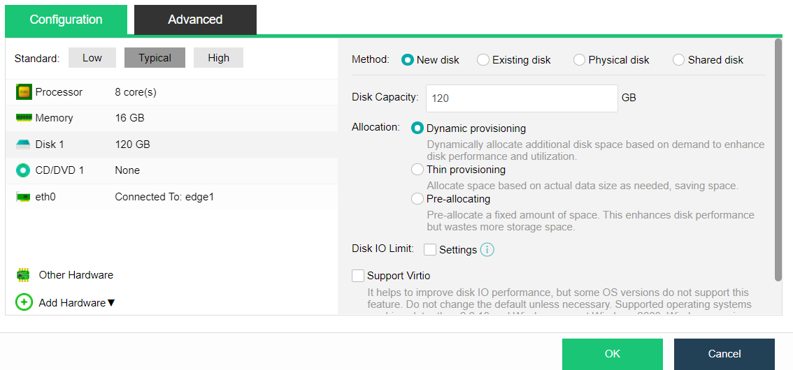 • Support Virtio: It helps to improve Disk IO performance, but some versions do not support this feature. Do not change the default unless necessary, which may cause the disk to be missing when installing the system. It is recommended not to change the default setting.
