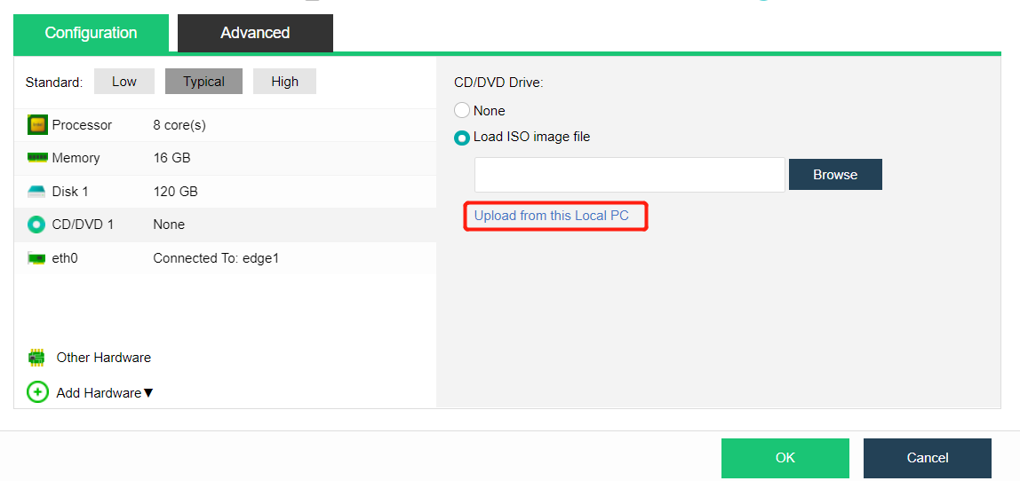 - After selecting the hardware information, select CD/DVD 1, click Browse, and click Upload from this Local PC.