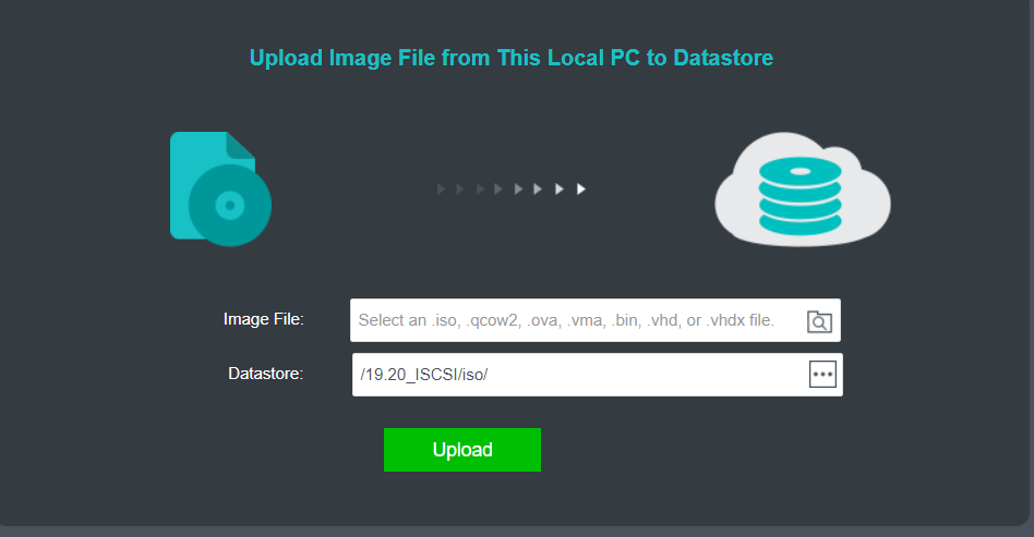 - CD/DVD: If the Load ISO image file is selected, you need to choose the corresponding ISO image file. You may upload an image file to the datastore from the local disk if there is no ISO image file. Click Upload from this Local Disk, select an ISO image file and upload it.