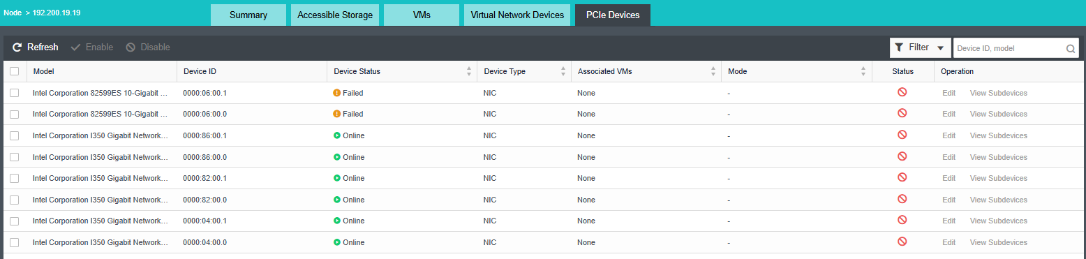 Go to Nodes > Nodes, hover your mouse over a host and click Summary. On the page that is displayed, click the PCIe Devices tab, where you can edit, enable, and disable a device, and view subdevices.
