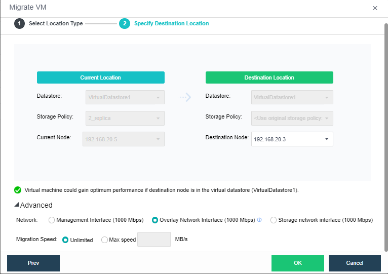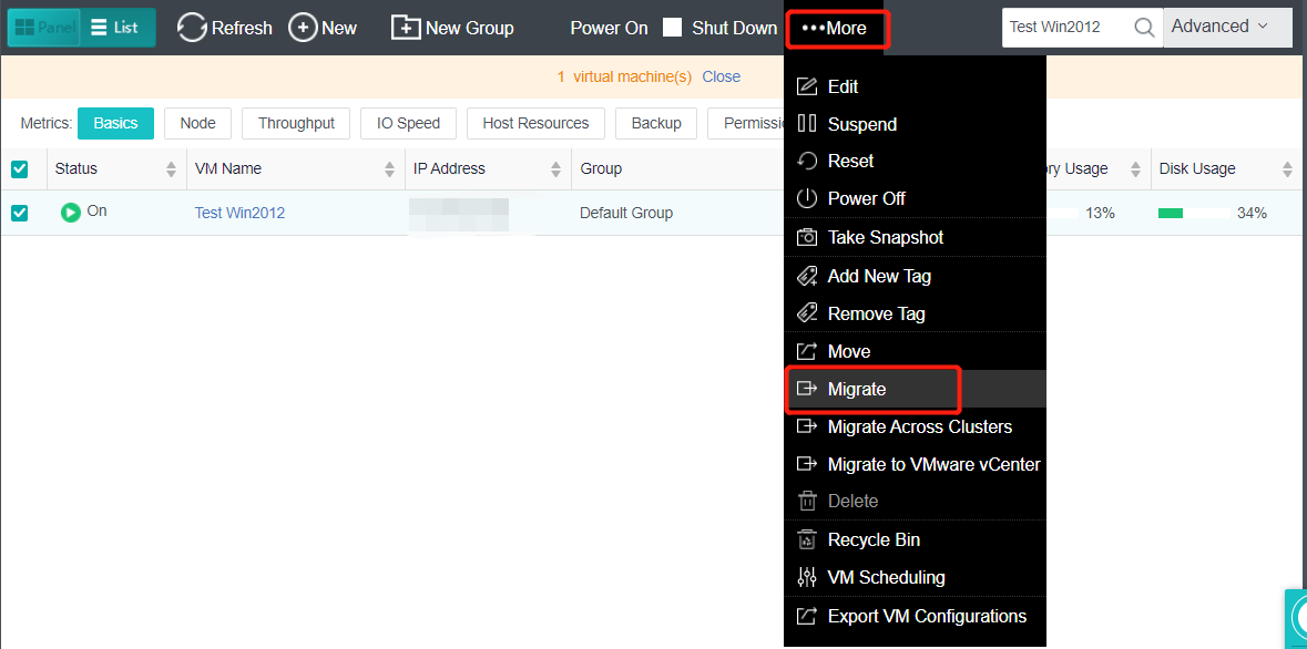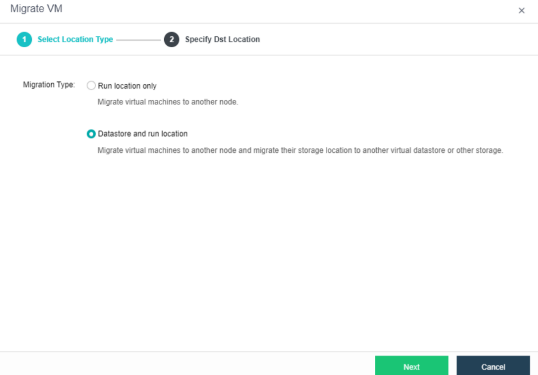 Click More > More > Migrate, and enter the Migrate VM page. Select a Migrate Type, click Next, and specify a destination datastore and a destination node.