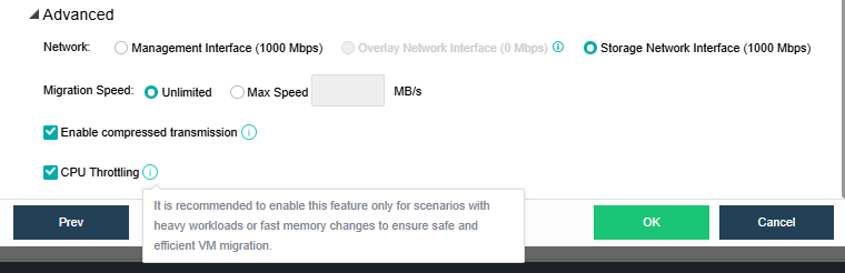 Click Advanced, configure the Network and Migration Speed, and select Enable compressed transmission and CPU Throttling as needed.