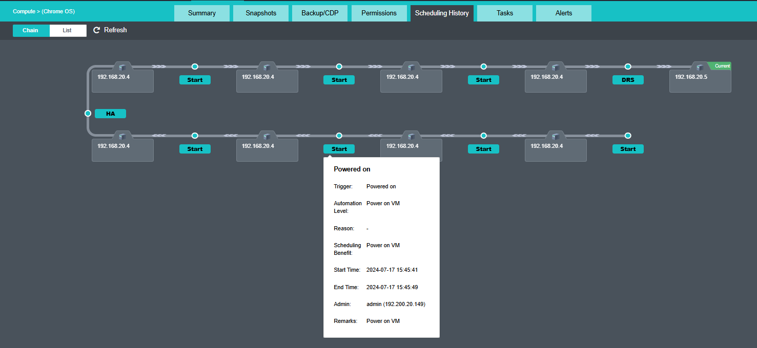 Go to the Scheduling History page of the VM to view the migration details by chain or by list.
