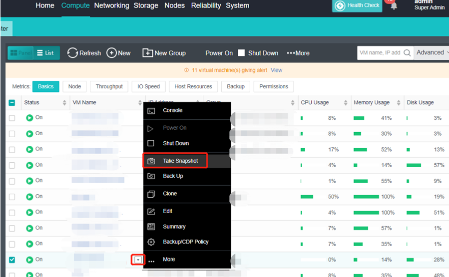 Go to Compute > List, click the drop-down arrow next to the target VM, and select Take Snapshot.