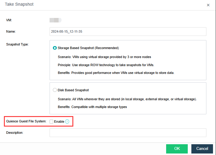 On HCI 6.9.0 or later, snapshots can be taken for quiesced Windows VMs. That is, a snapshot is taken after data in the file system cache or business system cache is stored in disks, ensuring data consistency. This feature is applicable for the following types of snapshots:
