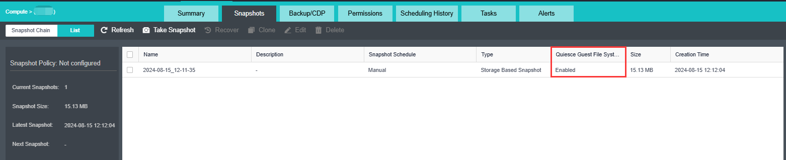 Quiescing VMs while taking snapshots will affect the business processing. Exercise caution when using this feature.