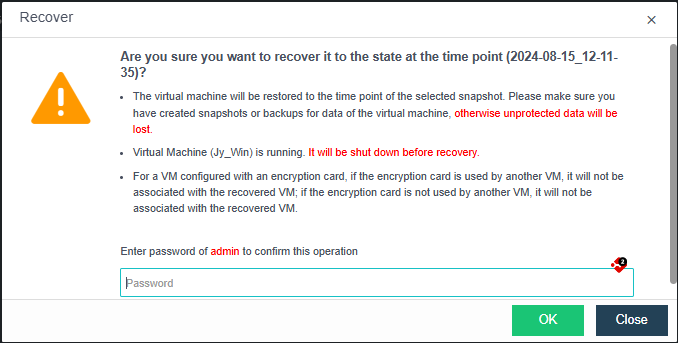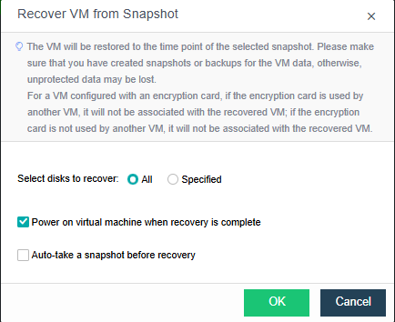 If you recover a running VM from the snapshot, the VM will be shut down after recovery by default. To enable the VM to automatically start after recovery, select Power on virtual machine when recovery is complete.