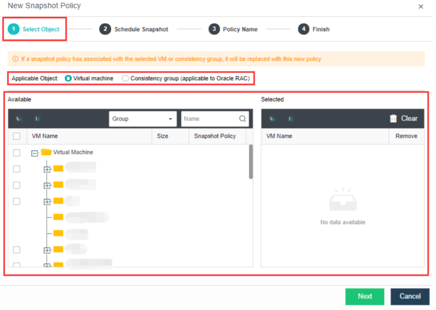 - If a selected VM or consistency group has already been added to a snapshot policy, it will be removed from the policy and added to the current one.