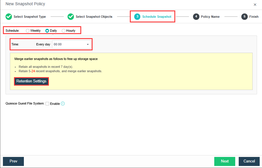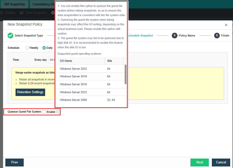 • In manual mode, you can specify whether to take snapshots by week, day, or hour, set the snapshot retention options to save storage space, and enable Quiesce Guest File System as required.