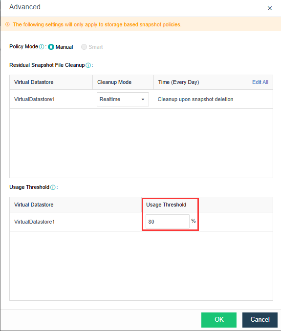 • Usage Threshold: Snapshots will not be taken as scheduled upon the reach of a threshold.