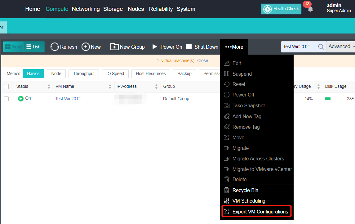 All virtual machine configuration information of the HCI platform can be exported by navigating to Compute > More > Export VM Configurations.