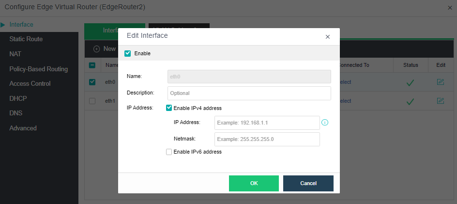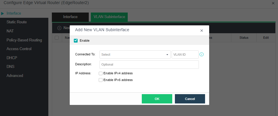 Click New under the Interface tab to configure the network interface and VLAN subinterface. The interface IP address supports IPv4 and IPv6 addresses.