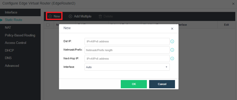 Click New under the Static Route tab to configure a static route. Static routes support IPv4 and IPv6.
